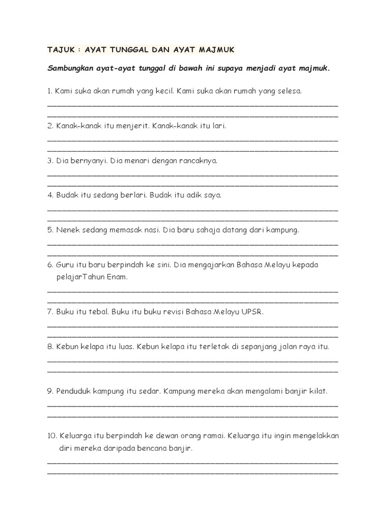 Ayat majmuk ialah ayat yang mengandungi lebih daripada satu subjek atau predikat yang digabungkan dengan kata hubung. Cikgu azhari akan datang esok. Ayat tunggal mempunyai ciri yang sama dengan ayat dasar. Ayat tunggal & ayat majmukdraft. Apabila berlaku pencantuman, unsur yang sama dalam ayat disusurkan. Saya dan hamid mengulangkaji pelajaran di sekolah. Ayat ini juga dikenali sebagai ayat selapis. Tan jia xiang mengambil buku cerita lalu membaca buku itu. Ayat tunggal dan ayat majmuk susunan kumpulan. Ayat tunggal merupakan ayat yang mengandungi 1 subjek dan satu predikat. Jabatan bahasa melayu sttss 6 months ago. Actividad online de ayat mudah para pendidikan khas. *ayat ini sebenarnya berasal daripada dua ayat tunggal iaitu :